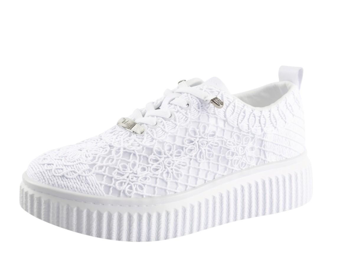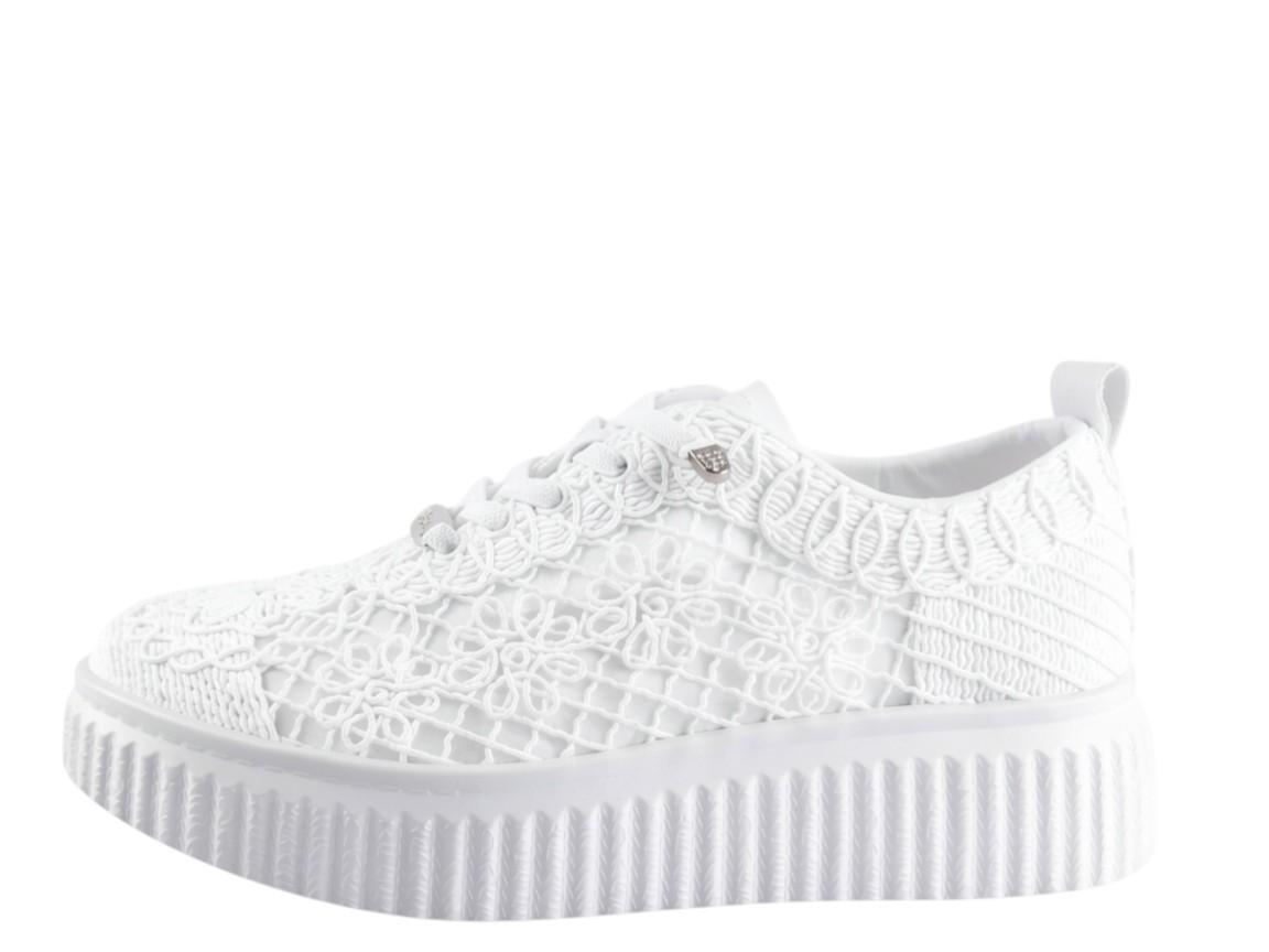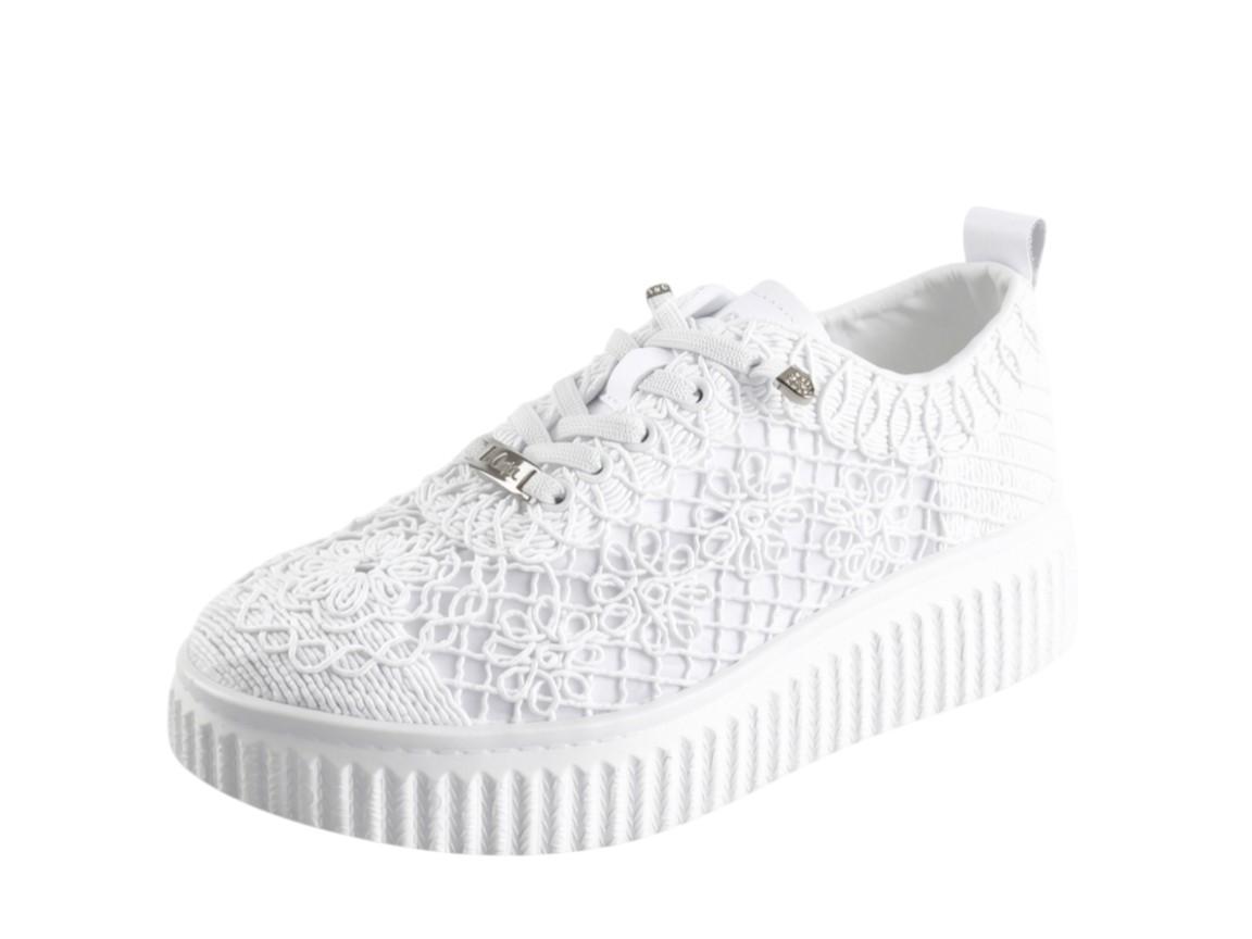 Dominantou těchto tenisek je nádherný textilní svršek s krajkovým vzorem. Jemné květinové motivy dodávají botám lehkost a eleganci, kterou u běžných sportovních tenisek nenajdete. Bílá barva působí svěže a velmi snadno se kombinuje s letními šaty, sukněmi i klasickými džínovými kraťasy.
