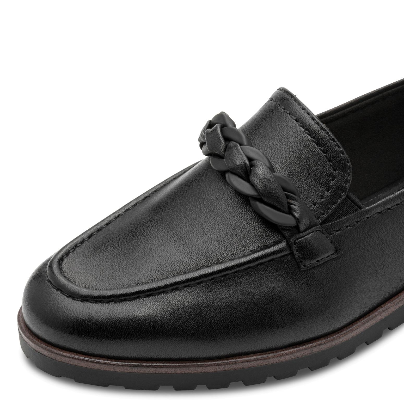 Tyto dámské mokasíny v černé barvě mají svršek z hladké kůže a vyznačují se kulatou špičkou a širokým podpatkem o výšce přibližně 2.3 cm. Elegantním detailem je ozdobný řetízek na nártu, který dodává obuvi sofistikovaný nádech. Díky svému klasickému a všestrannému designu jsou vhodné pro každodenní nošení.